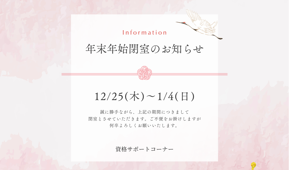 冬期休業期間に伴う資格サポートコーナーの窓口閉室についてお知らせします。